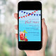 Blue water as background, a red drink and red and blue flags as decoration. Templates for your party details, information.