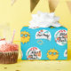 Fun pool party items featuring a happy yellow sun with sunglasses, a swimming pool and beach ball, fins and more. In bright blue.