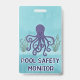 Provide safety and help prevent drowning in your pool. Pool safety monitor wears this badge and will focus on watching everyone swimming in the pool. Back of card lists signs of drowning and how to rescue a drowning person. Be responsible and safe at your pool parties or family and friends swim backyard swim time. Features a friendly octopus and typography text that reads Pool Safety Monitor.