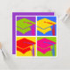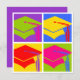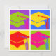 Pop art graduation invitation featuring four graduation caps with tassels in bright colours. Perfect for kindergarten, high school or college graduates. PinkInkArt original!