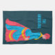 This personalised kitchen towel features an illustration of a 19th century woman wearing a bustle dress in bright pop art colours of bright blue, hot pink and yellow set against a navy blue background. The towel is ready to be personalised with a name or other text in bright blue lettering.