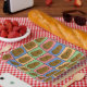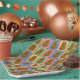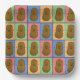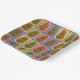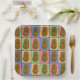 Fun colourful pop art style paper plates with a pattern of different coloured rectangles each with a happy brown potato in the middle.