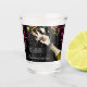 Celebrate any occasion with this festive shot glass. The design features the popping of a champagne cork and colourful streamers. The text reads, CELEBRATE! and there is an additional area for a name, date or special occasion. The background colour can be customised.