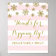 Thanks for popping by popcorn bar sign poster for baby shower, bridal shower, or wedding in light pink and white stripes pattern with gold snowflakes for winter celebrations.