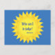 This postcard features a quote from Pope Francis within a yellow sun on a blue background. The colours are a part of the Pontiff's Coat of Arms. The text reads: Who am I to judge? It is an example of the greatness and humility of this very special man.