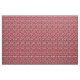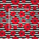 A floral fabric featuring red poppies in different sizes against black and white stripes.