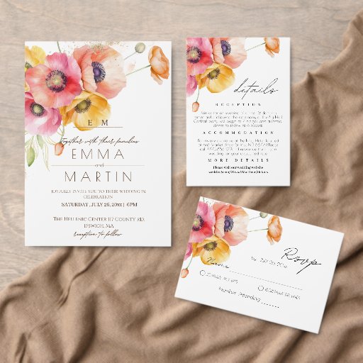 Modern Minimalist Wedding Invitation red poppies with gold dust are elegant and classic invite. Design features an handwritten font and modern minimalist design. To change details, click "Personalise".