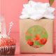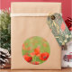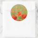 Round sticker of vibrant red poppy flowers in a green field full of poppies. It has a strong emotion of hapiness, spring and summer.