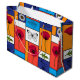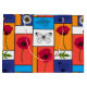 Colourful boxes and hand drawn poppies, daisy and butterfly, seamless vector pattern