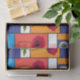 Colourful boxes and hand drawn poppies, daisy and butterfly, seamless vector pattern