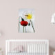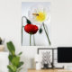 Our beautiful poster print for people who love flowers, especially poppies, features a photograph of a vibrantly coloured small red Iceland poppy that has just newly bloomed and a large white Iceland poppy with yellow centre. An orange and yellow hover wasp is on the white poppy. In the background of the photograph, there are silhouettes of poppies about to bud, with the stems of the young plants bending under the weight of the new buds. The photograph was taken in my garden. I grew the poppies from seed and am delighted with the results! The poster would make a colourful and bright, happy addition to any room of the home, including study, bedroom, living or dining room.