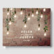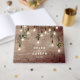 Weathered brick background with vintage string lights botanical design on front with bride and groom name over wedding date.