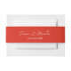 Poppy red and off-white wedding invitation belly band personalised with the names of the couple and the wedding date.
