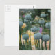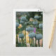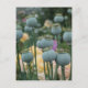 Postcard with photo of blue / green poppy seed heads with yellow roses in background.
