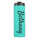 A matching accessory to my personalised leggings in this collection. A popular turquoise 12oz thermal tumbler with ample room for name and text. Easily personalise using the Template provided. Stainless body, plastic lid. Vacuum-sealed double walled construction retains temperature, hot or cold. See "About This Product" at side for more information and care.