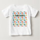 This baby t-shirt has a mid-century modern design of circles with lines behind in orange, yellow, turquoise, and green.