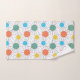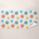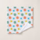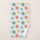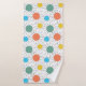 This towel set has a mid-century modern design of circles with lines behind in orange, yellow, turquoise, and green.