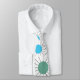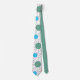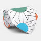 This necktie has a mid-century modern design of circles with lines behind in orange, yellow, turquoise, and green.