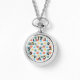 This women's watch has a mid-century modern design of circles with lines behind in orange, yellow, turquoise, and green.
