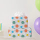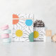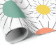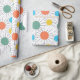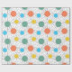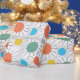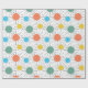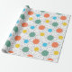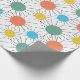 This wrapping paper has a mid-century modern design of circles with lines behind in orange, yellow, turquoise, and green.
