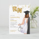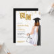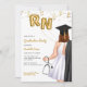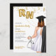 Portrait Nursing School Graduation Party Invitation. Curvy female Nurse Invitation for your daughter, niece, mother, aunt, cousin, or friend who is graduating from nursing school and is now officially a nurse. Women Nursing School Graduation Invitation for grad parties celebrating women who just graduated from nursing school. Celebrate the new Registered Nurse with this elegant nursing graduation invitation! Featuring portrait of a light skin, plus size woman with shoulder length brown hair. The nurse grad is wearing a stylish white dress, a black graduation robe draped over her shoulder, and a matching black graduation cap. She holds gold foil style balloons with the letters RN in one hand and a stethoscope in the other hand. Accented with shimmering gold confetti, it perfectly captures the joy and excitement of her big achievement.