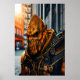 A orange bald alien with with alien clothing in the city. This is a AI generated art.