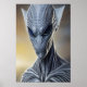 A portrait of a scary looking grey alien with blue eye. This is a AI generated art.