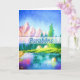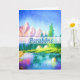 This vertical greeting card has a painting with a big outdoors landscape, a pink rocky mountain, a blue sky, a pine forest river valley, and a semitransparent stripe with the Portuguese birthday expression: “Parabéns” Inside, it has a Portuguese birthday greeting. This card is an elegant mailing item to send to your friends and loved ones. You can also match it with stickers, envelops, postcards, and stamps.