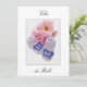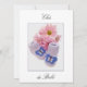 Customisable Invitation for baby shower in Portuguese. The inside contains the details about the party in English and Portuguese. Baby girl lavender booties with blue butterflies and light pink daisies in the background. Matching stamps available Convite personalizado para Chá de Bebé, com foto de botinhas de cor lavanda e borboletas azuis de crochet, e flores malmequeres cor de rosa no fundo. Detalhes sobre a festa dentro do cartão em Português e Inglês. Tambem há selos a condizer.