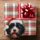 Colourful and joyful Christmas design with a Portuguese water dog wearing a Santa hat.