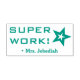 This motivating rubber stamp design features the motivating message "SUPER WORK!" and a personalised teacher name. It also features a decorative star outline shape. It could be used by a teacher or educator when marking assignments, to acknowledge that the student has done a great job.