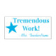 This inspirational rubber stamp design features the praise message "Tremendous Work!" and a customised teacher name. It also features a decorative star shape. It could be used by a school teacher, educator, or tutor when grading student work, to indicate that a student has done an exceptional job.