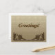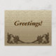 Two graphic images of leafy angle irons in the lower corners. Personalise the text that appears above (defaults to "Greetings!"). Background is a linen texture in beige.
