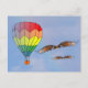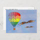 Hot Air Balloon and two birds fly in a blue sky with faint clouds. Balloon has rainbow stripes of red, orange, yellow, green, and blue. Birds have brown wings. Back of card has title "Come Fly With Me."