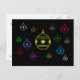 Fourteen round globe ornaments with central bands showing star bursts, are in various sizes, covering this card with a black background. Text on message side reads "Happy Holidays - Wishing you happiness for the New Year!"