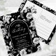 Very elegant black and white rose floral pattern creates an 18th birthday postcard invitation template. White text and calligraphy are framed by a black arch edged in white. This item is part of the Black and White Rose Floral Collection. it contains templates to create a unique invitation suite, welcome signs and party decorations.