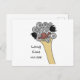 This postcard features a hand-drawn doodle of a curious ostrich emerging from a cloud of simple circles. The playful illustration pairs naturally with the message “Long time no see”, turning a familiar phrase into a warm, visual greeting.