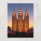 Postcard - The photograph features the Salt Lake Temple at dusk. The Temple has taken on a golden hue as the sunsets in the West behind the Temple. The temple lights are lite.