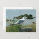 Seagull standing on old piling at edge of river. Rocks and grasses are in background, as well as the river waters.