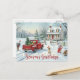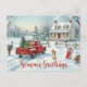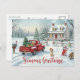 Send heartfelt holiday cheer with this “A Very Merry Little Christmas” postcard featuring a vintage red pickup truck driving home through the snow toward a charming farmhouse adorned with Christmas lights and garlands. The peaceful winter-white countryside, gentle snowfall, and classic holiday details -- from cheerful snowmen to a playful dog in the yard -- capture the warmth and nostalgia of a traditional Christmas season.