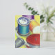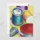 Vertical postcard for anyone who sews. The coloured pencil drawing is a mixture of sewing items: vintage wooden spools, a silver thimble and tape measure.