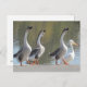 Geese and pelican strolling at edge of lake. Brown geese with white stomach and necks have large basal knob on the upper side of the bill. All three are strutting along lakes edge with heads held high. In background is one white pelican and the calm waters of the lake.