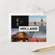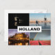 Postcard with a collage of four landscape photos of Holland, like the windmills of Kinderdijk at night, a windmill with tulips and a rainbow, ice skating in winter and the architecture of Amsterdam and the text: 'Holland'.