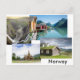 Postcard with 4 landscapes in Norway, a boathouse, boats and a fjord and a stave church with a white border and the tekst: 'Norway'.