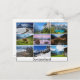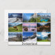 Postcard with a collage of nine photos from landscapes of the alpine country Switzerland, like Matterhorn mountain, Bernese Oberland, Wengen, Lauterbrunnen, Lavertezzo, Ticino, Oeschinensee Lake and Grimentz with a white border and the text: 'Switzerland'.