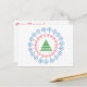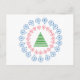 A stylised green tree sits in the centre of circle of small red ornaments, inside a circle of medium sized blue ornaments. "Merry Christmas!" text in red script on message side of card may be edited/removed.