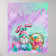 Easter Bunny Gnome with pink bunny ears sitting in spring flowers with decorated eggs and a wicker basket of carrots set on a watercolor teal and purple plaid background with pastel candy icing drips.