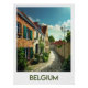 Charming illustration of a typical cobbled street in Belgium, lined with traditional red brick houses, green shutters and climbing plants. A perfect poster for romantic and picturesque wall decor.