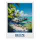 Stunning illustration of Belize featuring a wooden dock over turquoise waters, surrounded by palm trees and tropical flowers. A perfect poster for relaxing and paradise-inspired wall decor.