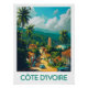 A colorful illustration of a village in Côte d’Ivoire surrounded by palm trees and mountains, with a vintage touch. A poster perfect for a warm and exotic mural.